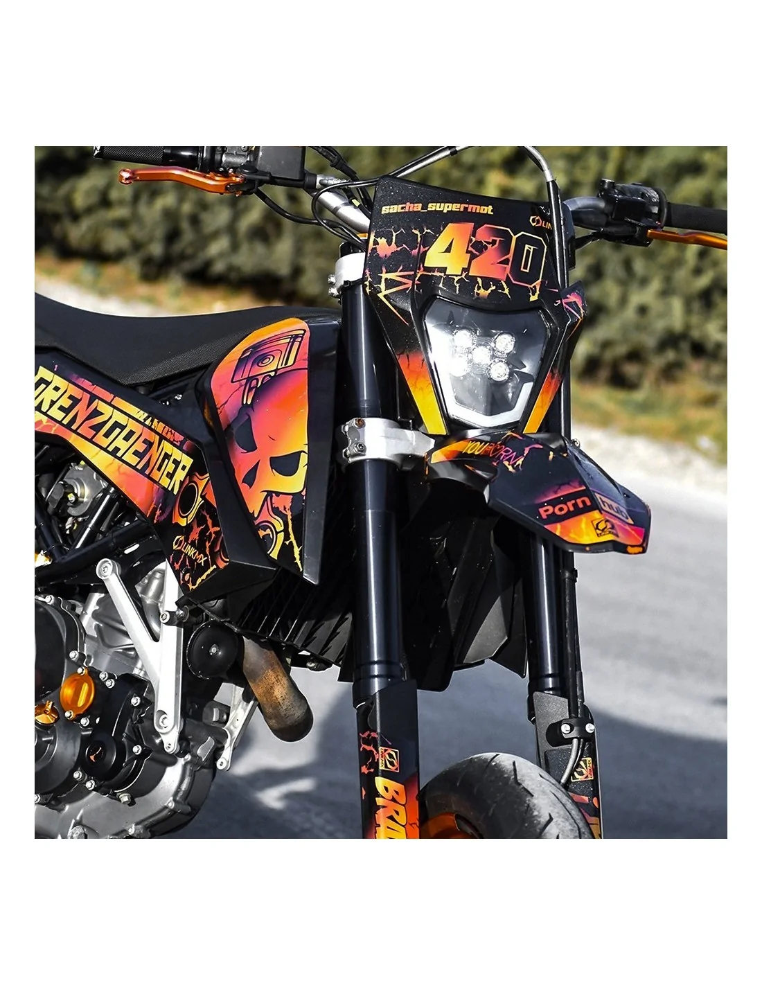 Frontplatte | 2x Kühlerentlüftungen | 2x Seitennummerntafeln | 2x Luftfilterkästen | Vorderradkotflügel | Hinterradkotflügel | 2x Gabelschützer | 2x Schwingenaufkleber | Tankaufkleber (nach unseren Vorlagen).Bereiten Sie die Installation Ihres Dekorationssets vor.