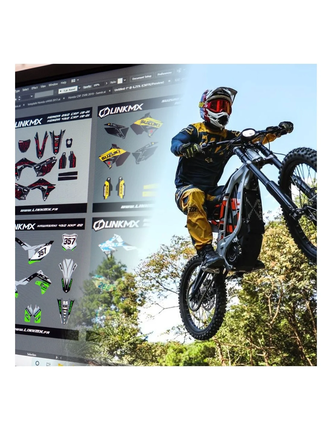 Front plate | 2x radiator vents | 2x side number plates | 2x air boxes | front fender | rear fender | 2x fork guards | 2x swingarm stickers | tank sticker (according to our templates).Prepare for the installation of your decoration kit