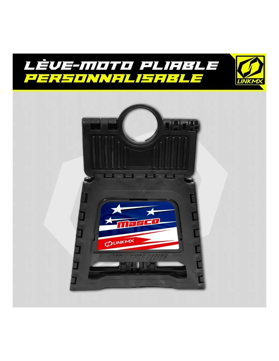 The LinkMX advantage : we offer customization of your motorcycle lift plate with the image from your LinkMX graphics kit!