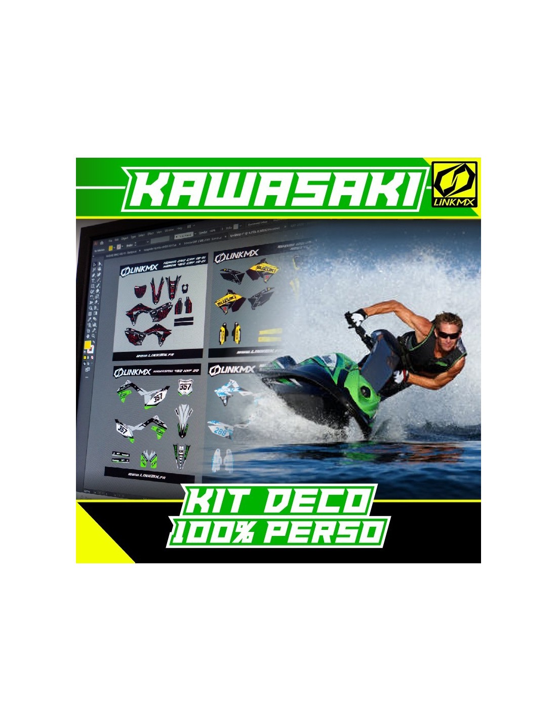 Kit de decoración LinkMX Series 100% personalizado, ¡una creación gráfica personalizada para tu KAWASAKI Jet con brazos!