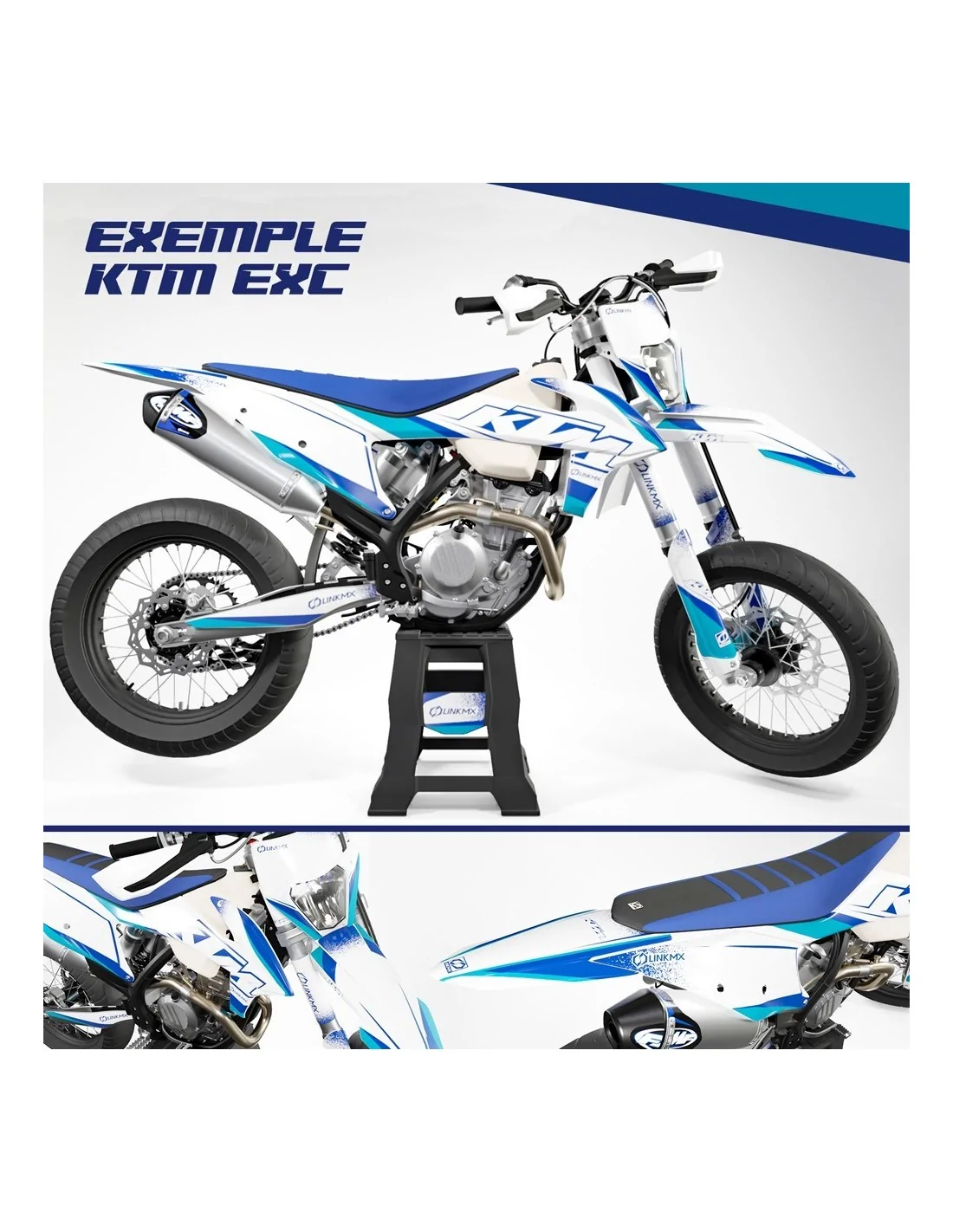 Plaque frontale | 2x ouïes de radiateur | 2x plaques numéro latérales | 2x boîtes à air | garde-boue avant | garde-boue arrière | 2x protèges-fourches | 2x stickers bras oscillant | sticker de réservoir (si nous disposons du gabarit).Préparez la pose de votre kit déco
