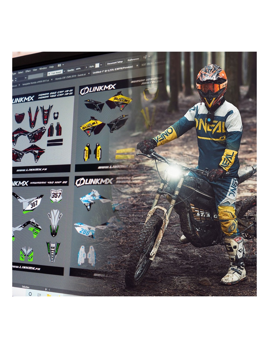 Plaque frontale | 2x ouïes de radiateur | 2x plaques numéro latérales | 2x boîtes à air | garde-boue avant | garde-boue arrière | 2x protèges-fourches | 2x stickers bras oscillant | sticker de réservoir (selon nos gabarits).Préparez la pose de votre kit déco