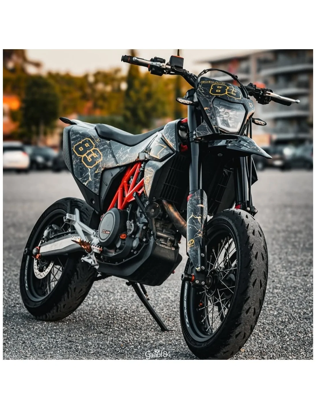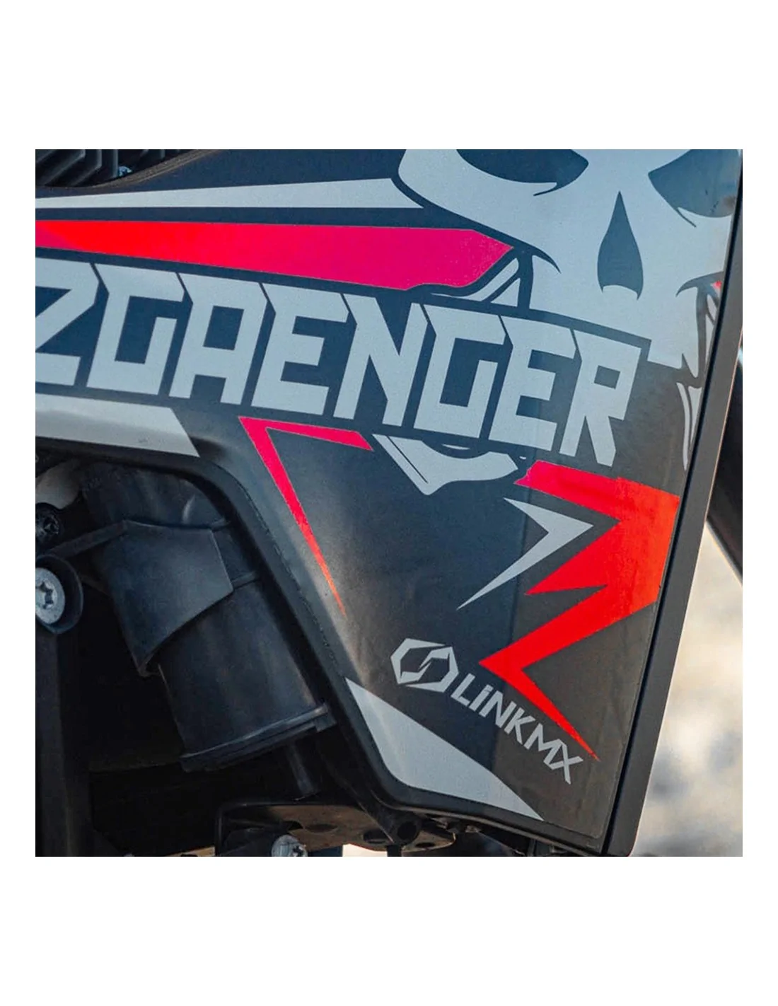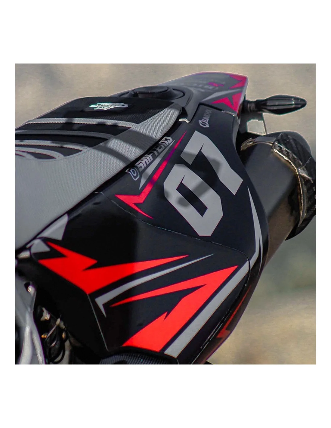 Plaque frontale | 2x ouïes de radiateur | 2x plaques numéro latérales | 2x boîtes à air | garde-boue avant | garde-boue arrière | 2x protèges-fourches | 2x stickers bras oscillant | sticker de réservoir (selon nos gabarits).Préparez la pose de votre kit déco