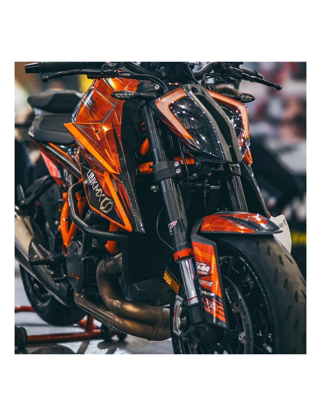 Plaque frontale | 2x ouïes de radiateur | 2x plaques numéro latérales | 2x boîtes à air | garde-boue avant | garde-boue arrière | 2x protèges-fourches | 2x stickers bras oscillant | sticker de réservoir (selon nos gabarits).Préparez la pose de votre kit déco