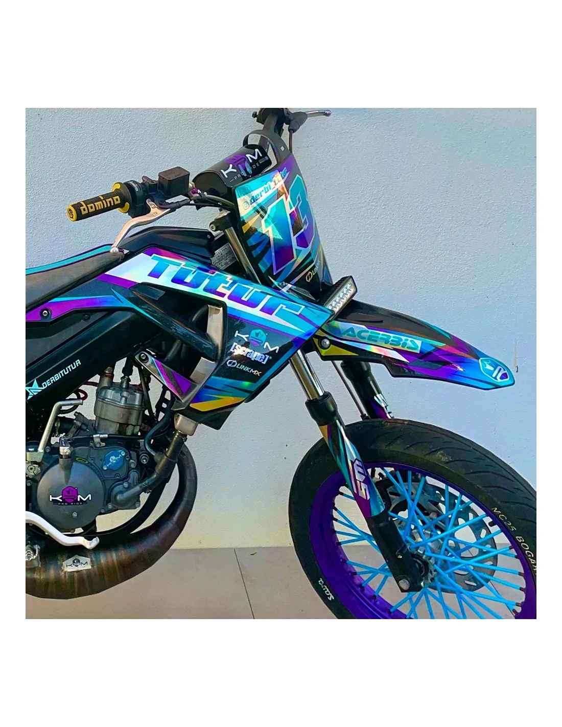 Targa anteriore | 2 prese d'aria per radiatore | 2 targhe laterali | 2 air box | parafango anteriore | parafango posteriore | 2 protezioni forcella | 2 adesivi per forcellone | adesivo per serbatoio (secondo i nostri modelli).Preparati per l'installazione del tuo kit di decorazione