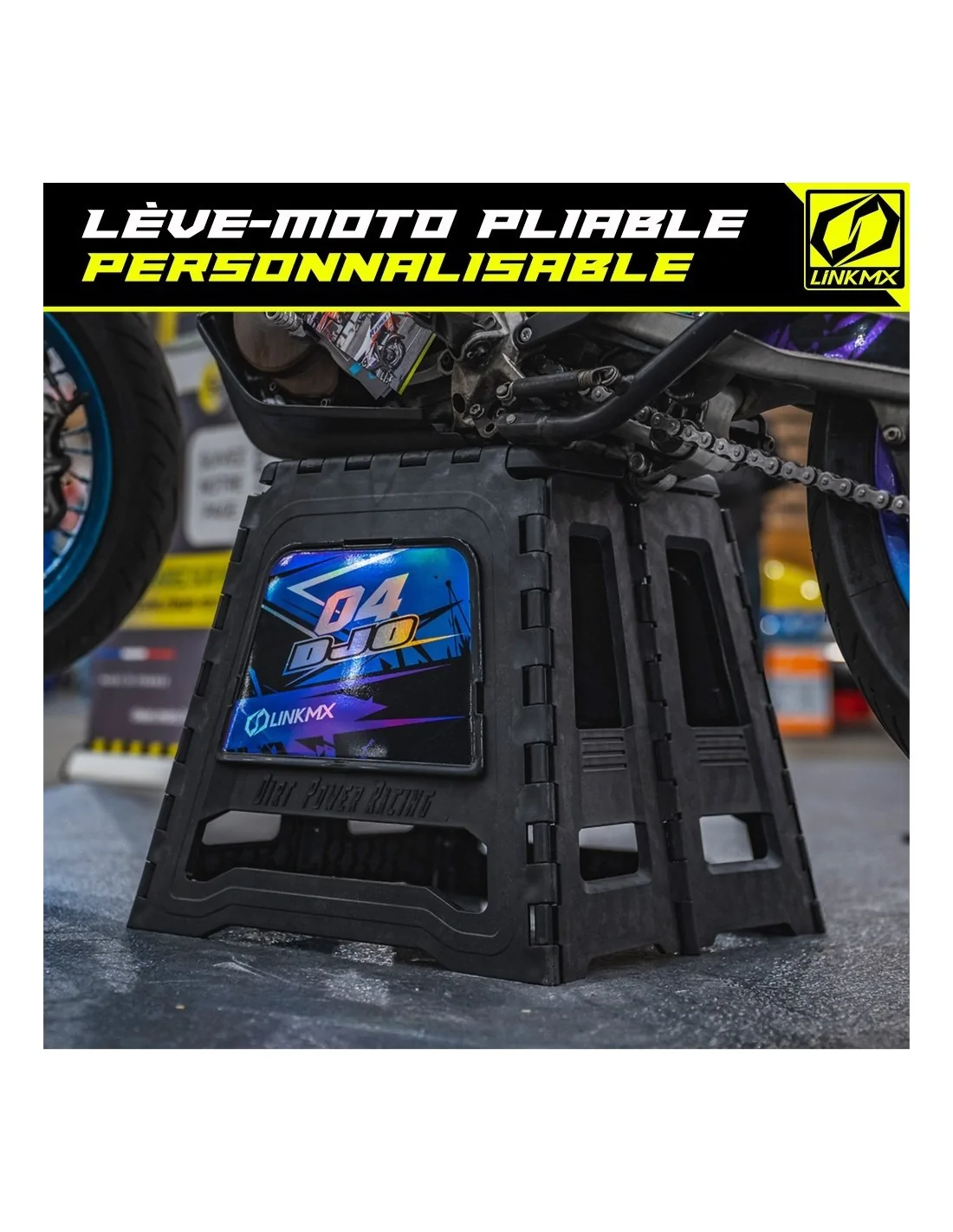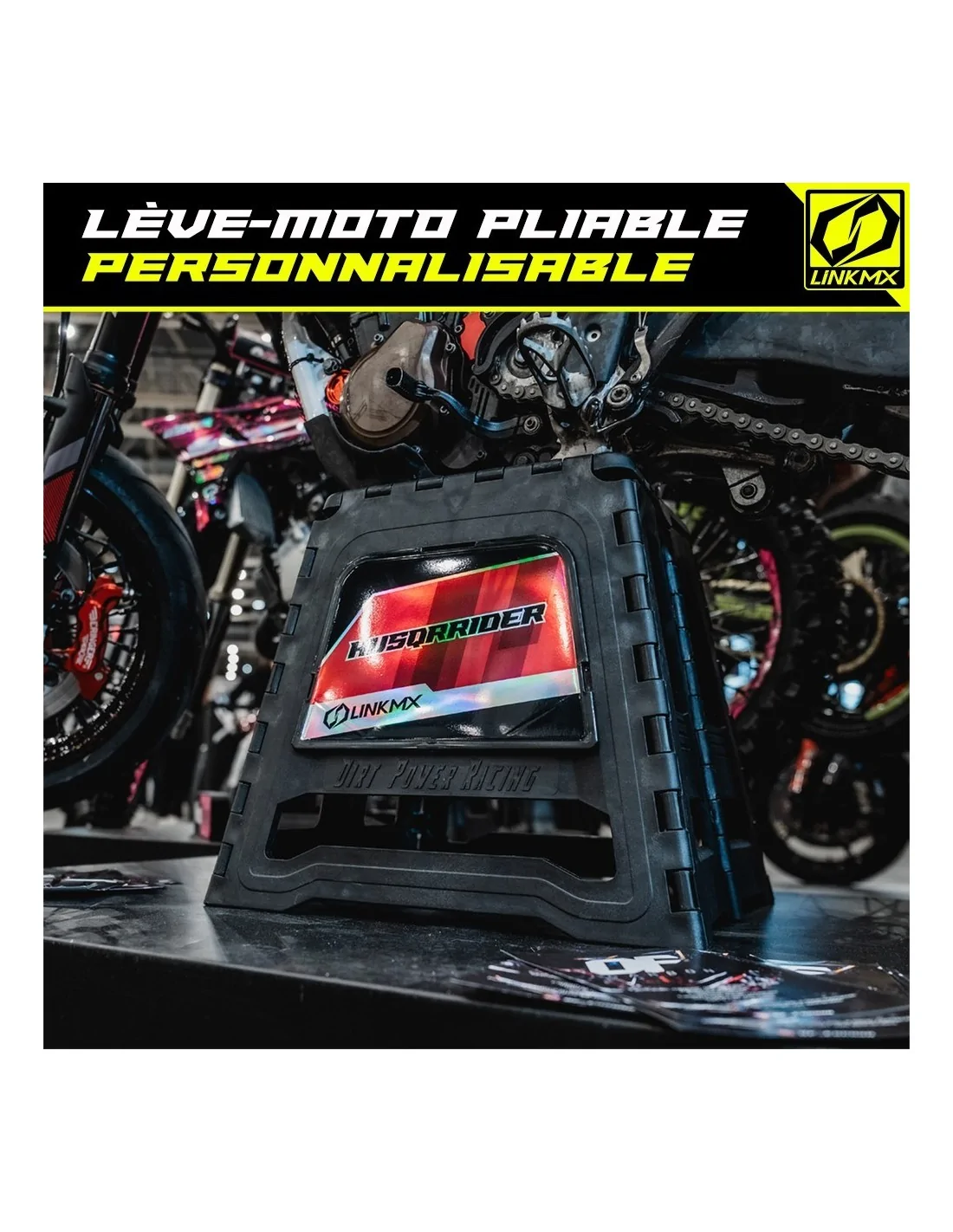 Il vantaggio di LinkMX : offriamo la personalizzazione della piastra di sollevamento della tua moto con l'immagine del tuo kit grafico LinkMX!